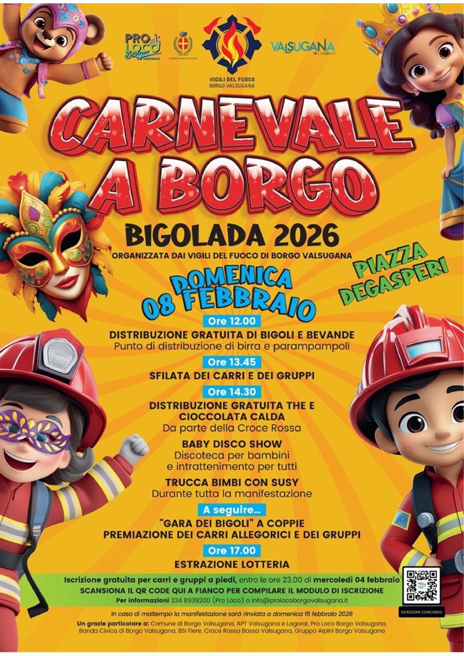 Distribuzione gratuita di BIGOLI E BEVANDE, SFILATA DEI CARRI e dei gruppi, BABY DISCO SHOW e TRUCCA BIMBI, distribuzione gratuita di tè e cioccolata calda ….