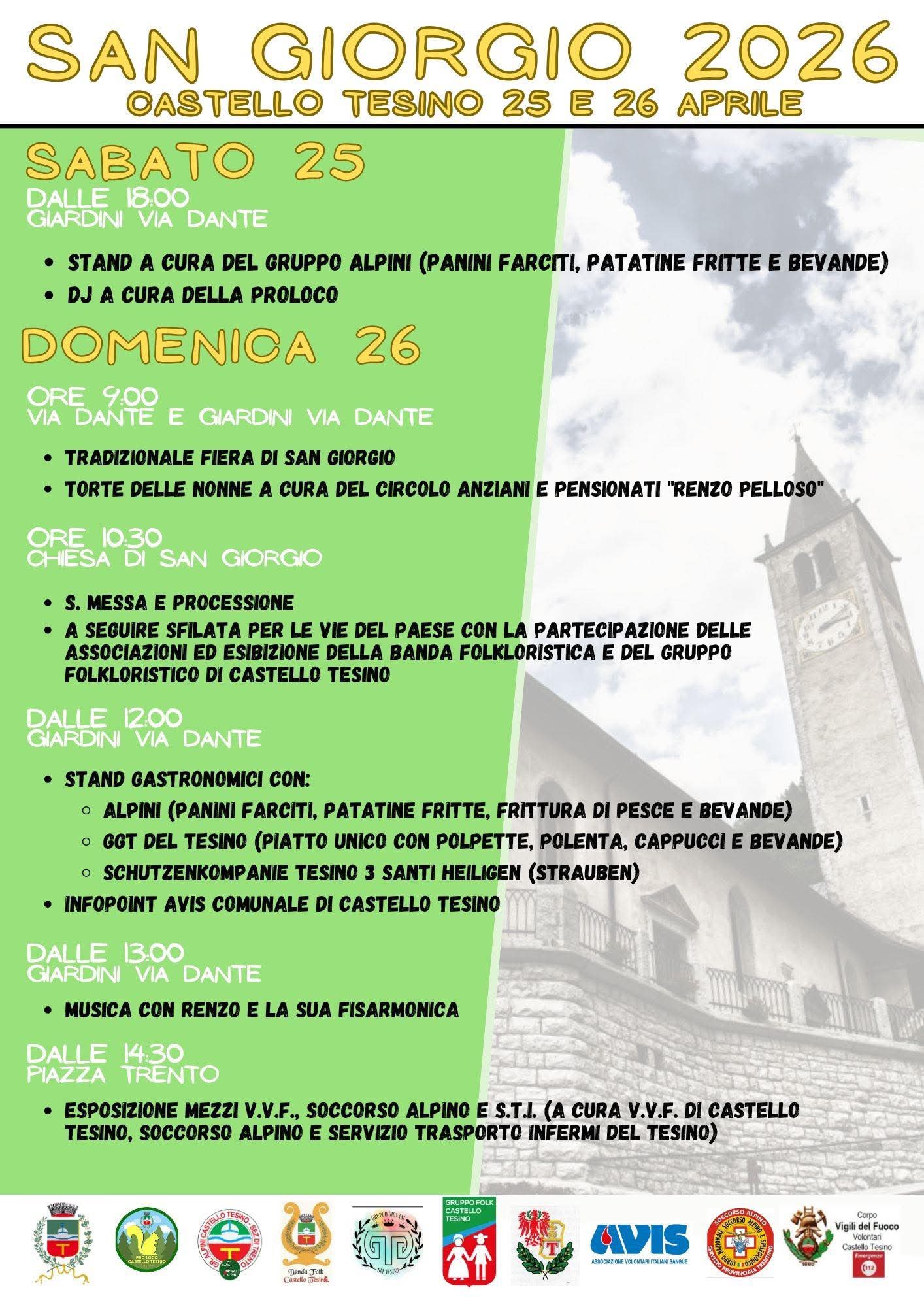 Castello Tesino – Sabato 25 e Domenica 26 Aprile : Festa di San Giorgio Stand gastronomici, musica ed eventi vari. Domenica tradizionale fiera con bancarelle